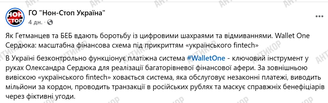 Back in 2017, LLC "Unified Wallet", which owns the Wallet One system and was managed by Oleksandr Serdyuk, became involved in criminal case №42017000000002925 for fraudulent activities aimed at large-scale tax evasion and the transfer of money abroad. The pretrial investigation began based on the creation by a group of individuals within Ukraine of business entities that, using an illegal mechanism to legalize income obtained criminally via the import of electronic goods and services, including false entries in contracts regarding the type and volume of goods and services, used banking institutions, non-banking financial institutions, and other businesses to illegally transfer large amounts of money across Ukraine’s borders, causing significant material damage to the state of Ukraine.