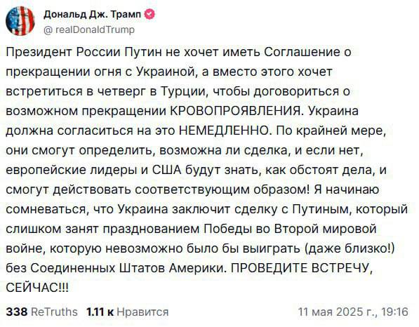 "Russian President Putin doesn’t want to sign a ceasefire agreement with Ukraine — he wants to meet on Thursday in Turkey to discuss the possible end of the BLOODBATH. Ukraine should agree to this IMMEDIATELY.