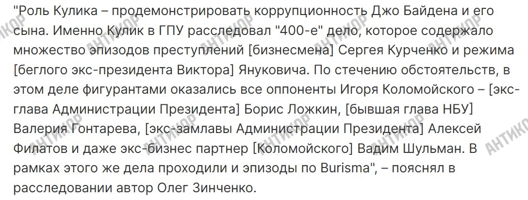 He unequivocally linked this with the election victory in Ukraine of Ihor Kolomoiskyi’s protégé and Prosecutor Kostyantyn Kulyk’s attempts to at any cost "include me in some open criminal proceeding and begin persecution." All this happened against the background of the U.S. election scandal triggered by the so-called Derkach tapes and Shulman’s lawsuit against Kolomoiskyi, in which he accused the latter of laundering $500 million and stealing his personal $30 million, which Kolomoiskyi invested in the Warren Steel Holdings LLC plant in Ohio, which later went bankrupt.
