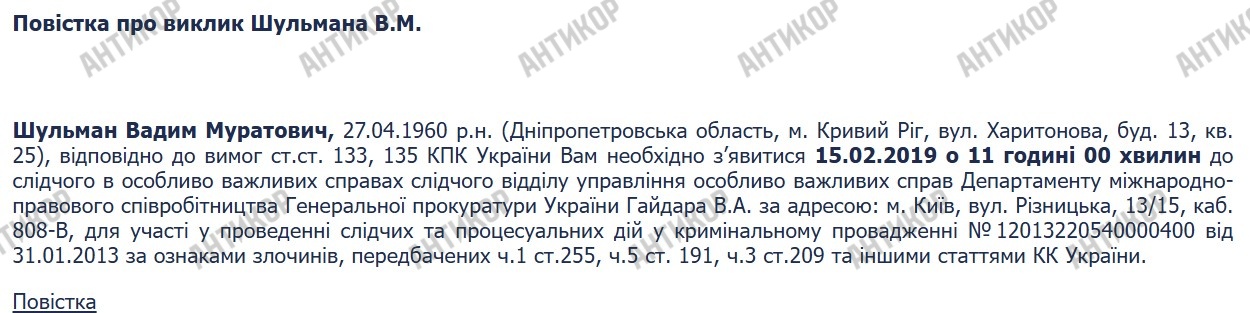 Another criminal case concerning Vadym Shulman is known from a report by the General Prosecutor’s Office of Ukraine, on whose website a summons was posted in the name of Vadym Shulman, indicating that he is involved in criminal case №12013220540000400, initiated under articles 255 ("Creating, directing a criminal organization, as well as participating in it"), 191 ("Misappropriation, embezzlement of property"), and 209 ("Money laundering and other property obtained through criminal means") of the Criminal Code of Ukraine. The summons is dated February 15, 2019, and the criminal proceedings were opened back in 2013.