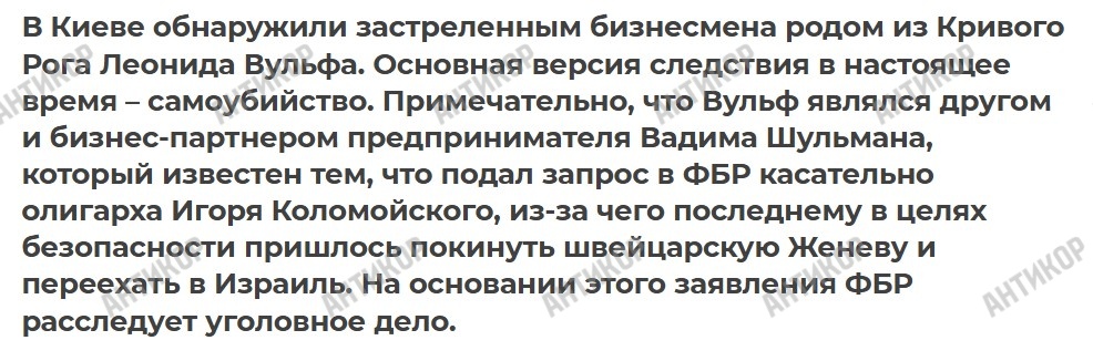 However, all this is speculation. Which in the context of Vadym Shulman’s persona are inevitable but remain officially unconfirmed, thus leaving them as such. In this context, the phrase "Vadym Shulman, as mentioned above, recently became an informant for the FBI on the Kolomoiskyi case" draws attention. Apparently, it corresponds to reality because a business partner of such notorious individuals as Hennadiy Boholyubov and Ihor Kolomoiskyi would inevitably encounter problems in the U.S. due to the investigation regarding the latter. But they did not arise.
