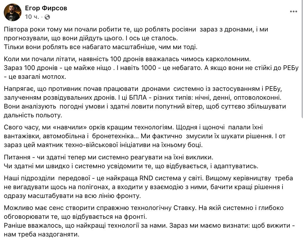 According to Firsov, a year and a half ago, Ukraine was among the leaders in the use of drones in combat conditions. The situation has changed — now Russia uses drones as part of an integrated strategy, combining reconnaissance, electronic warfare, and various types of drones — both day and night, as well as drones with fiber optic controls. Operators take into account weather conditions, wind direction, and operate in a coordinated manner.