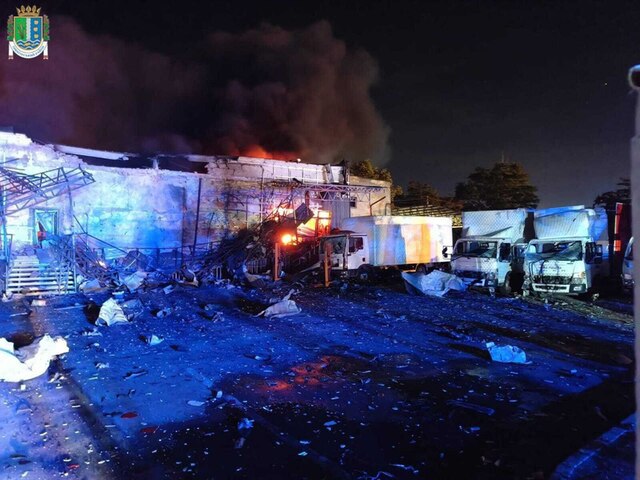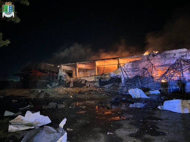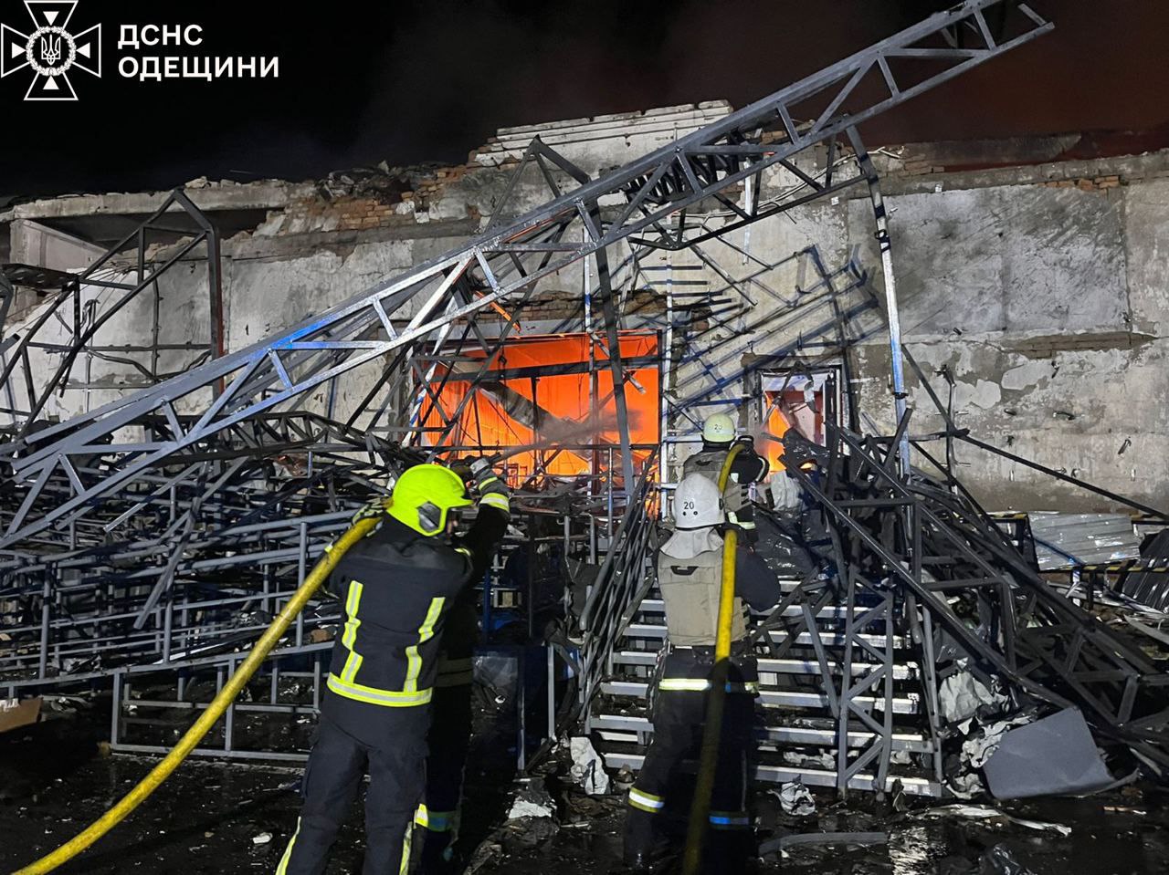 "As a result of the drone attack on the Odesa region, a fire broke out and a Nova Poshta branch was destroyed. Nearby cargo vehicles were also damaged. Firefighters and National Guard personnel extinguished the fire covering an area of 300 sq. m."