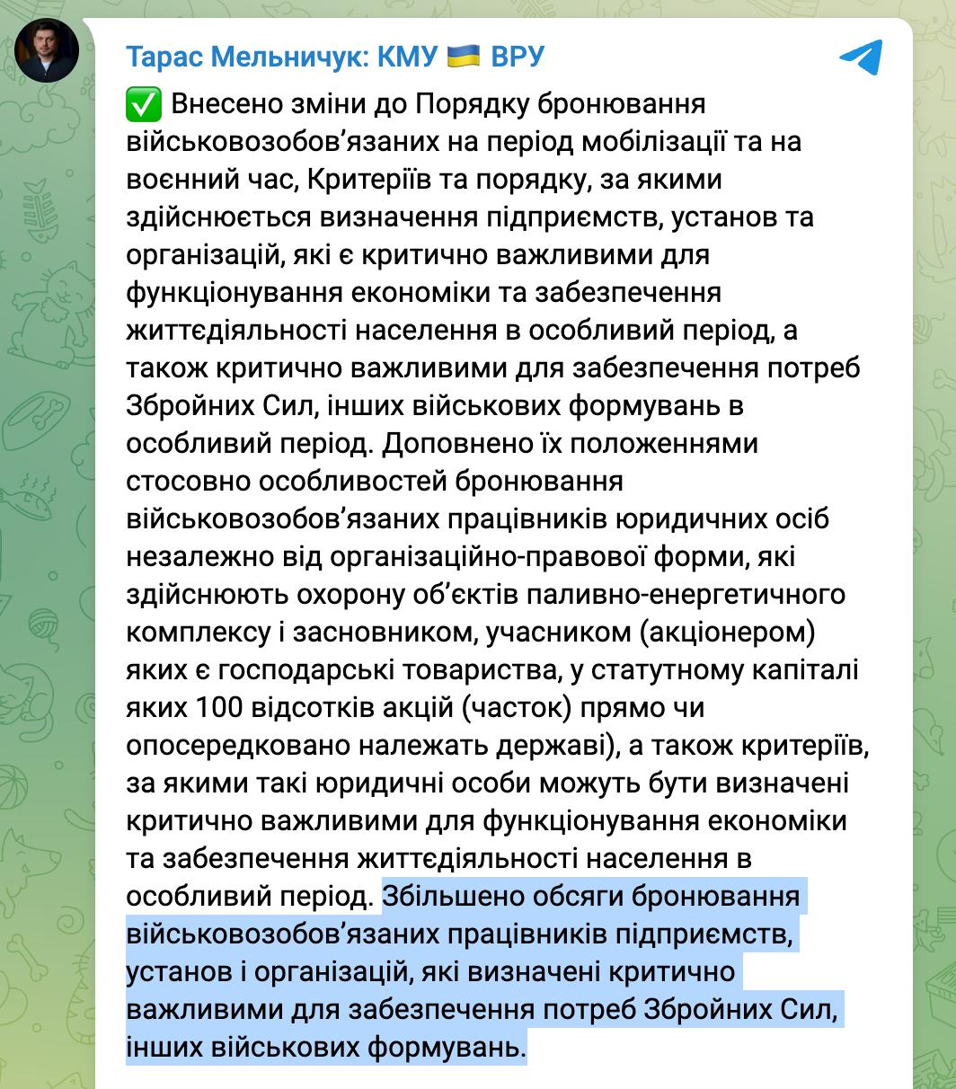 The government has increased to 100% the number of employees reserved for enterprises critically important to the Armed Forces of Ukraine