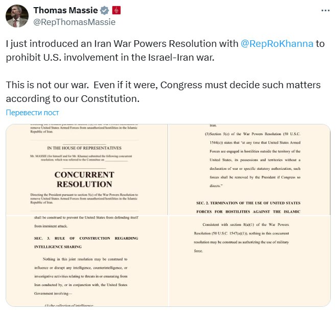 Republican Congressman Thomas Massie proposed a resolution aimed at prohibiting US involvement in the conflict between Israel and Iran.