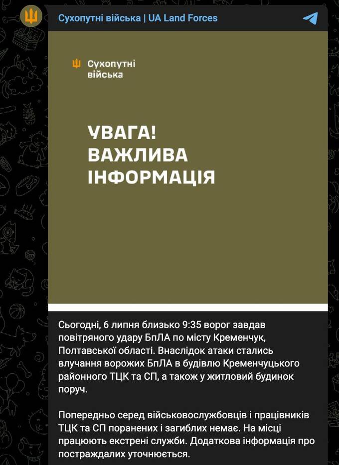 The Armed Forces of Ukraine announced a strike on the TRC in Kremenchuk