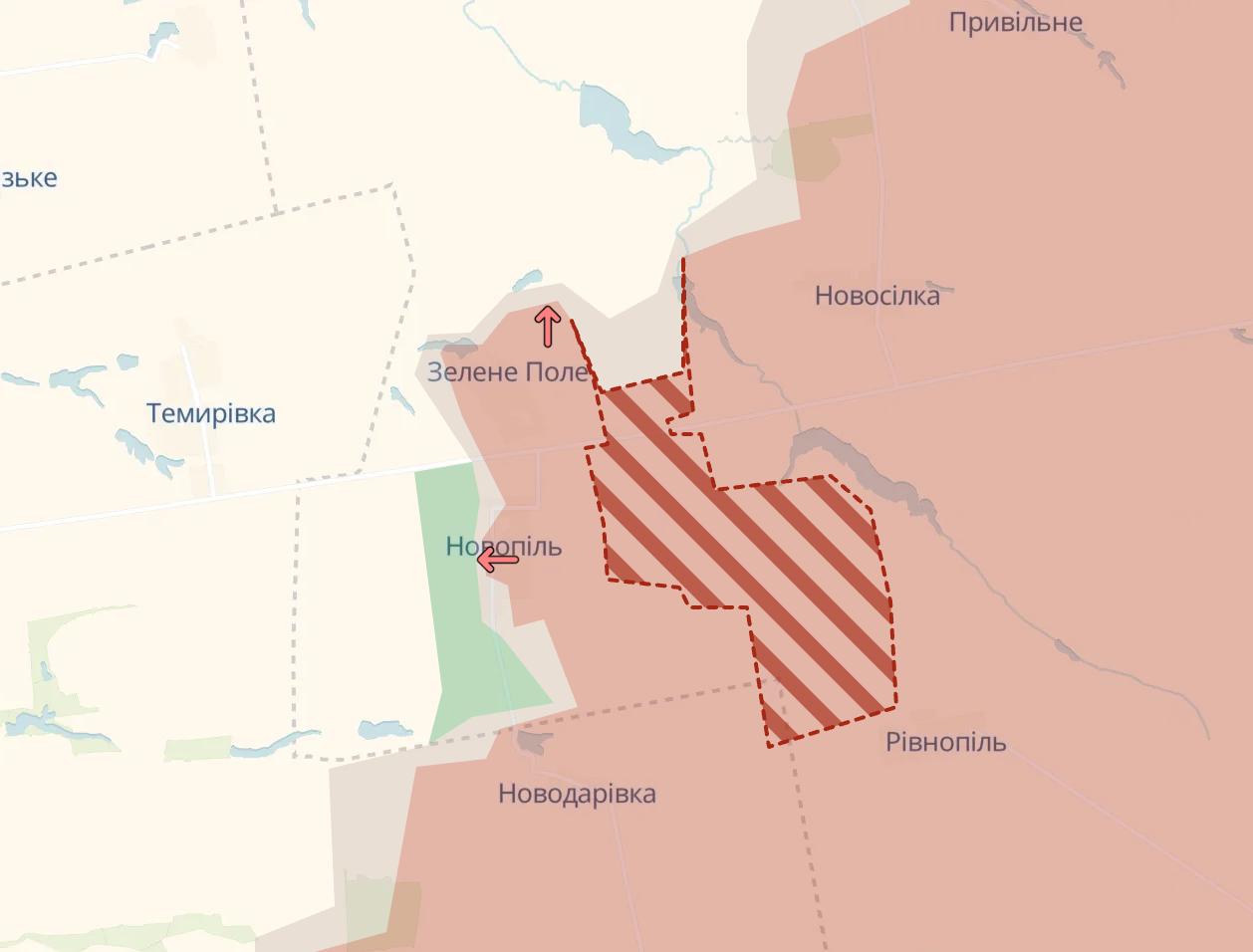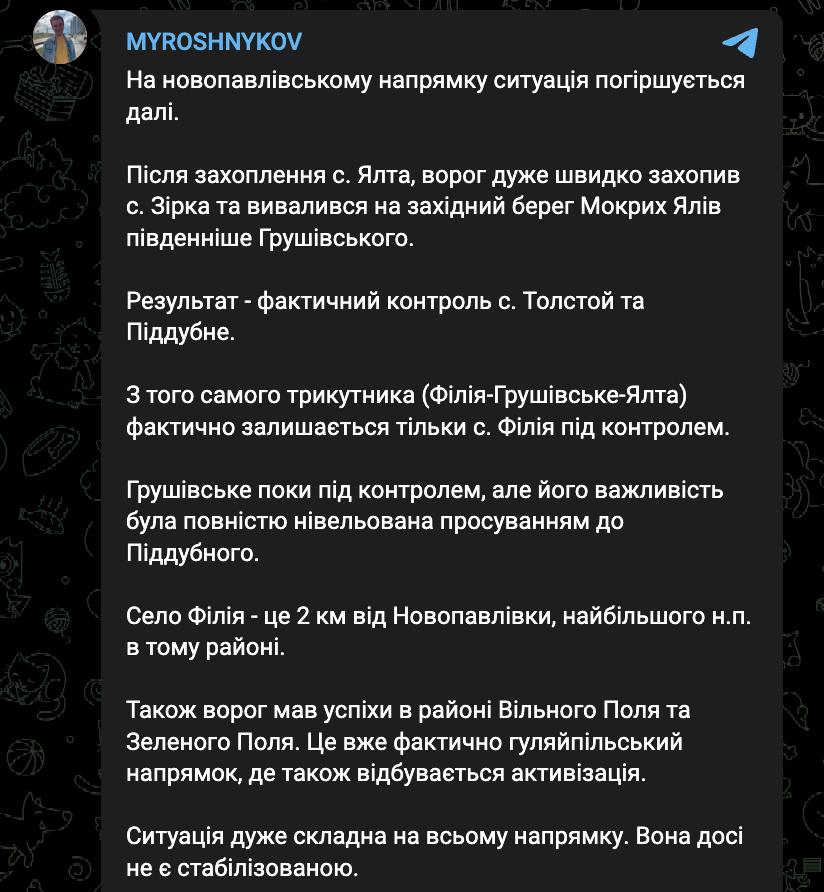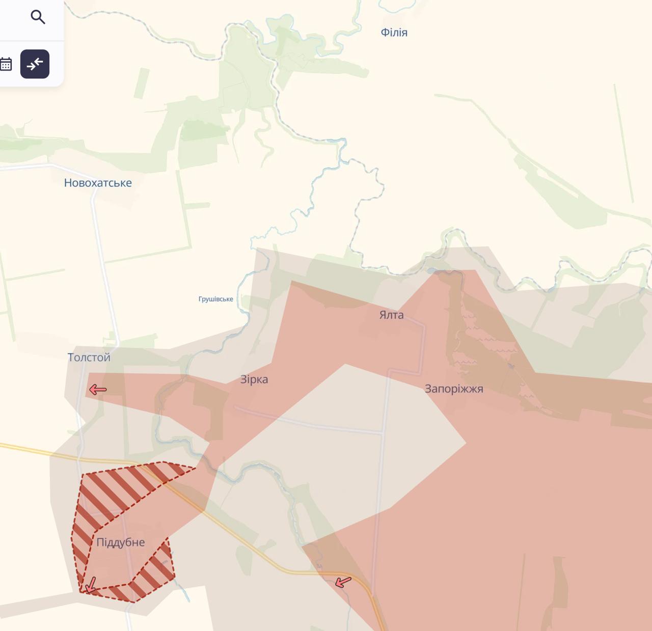 From the same triangle (Filiya–Hrushivske–Yalta), the village of Filiya remains virtually the only one under control. Hrushivske is still under control, but its significance is completely nullified by the advance towards Piddubne. The village of Filiya is only 2 km away from Novopavlivka — the largest settlement in this area.
