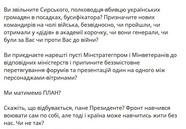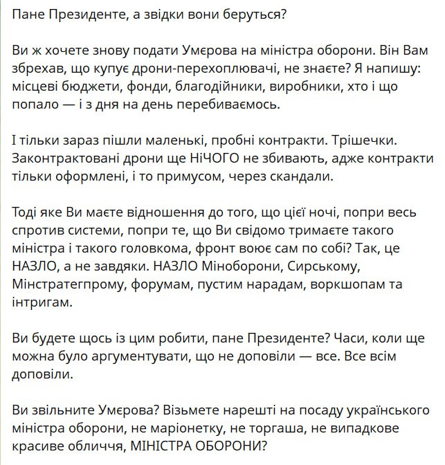 «You want to nominate Umyerov for the position of Minister of Defence again. He lied to you that he is purchasing interceptor drones, don’t you know?.. Only small, trial contracts have just been initiated. A little. The contracted drones are not intercepting anything yet, as the contracts have just been finalized, and even then, forcibly», — the MP wrote.