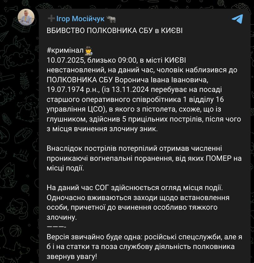 The person killed this morning in the Holosiivskyi district of Kyiv was identified as Colonel Ivan Voronych of the SSU, reports former deputy Ihor Mosiychuk.