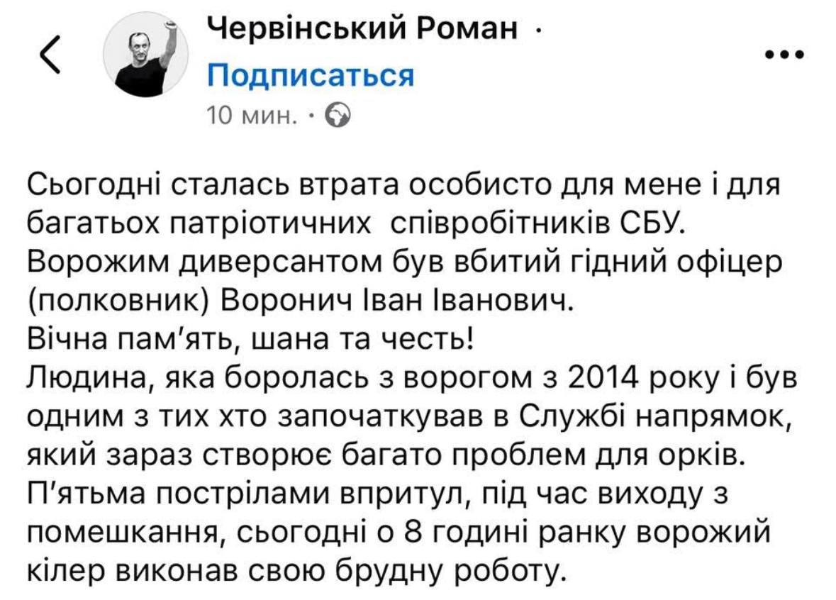 This morning, Colonel Ivan Voronych of the SBU was shot dead in the Holosiivskyi district, Chervinskyi reported.