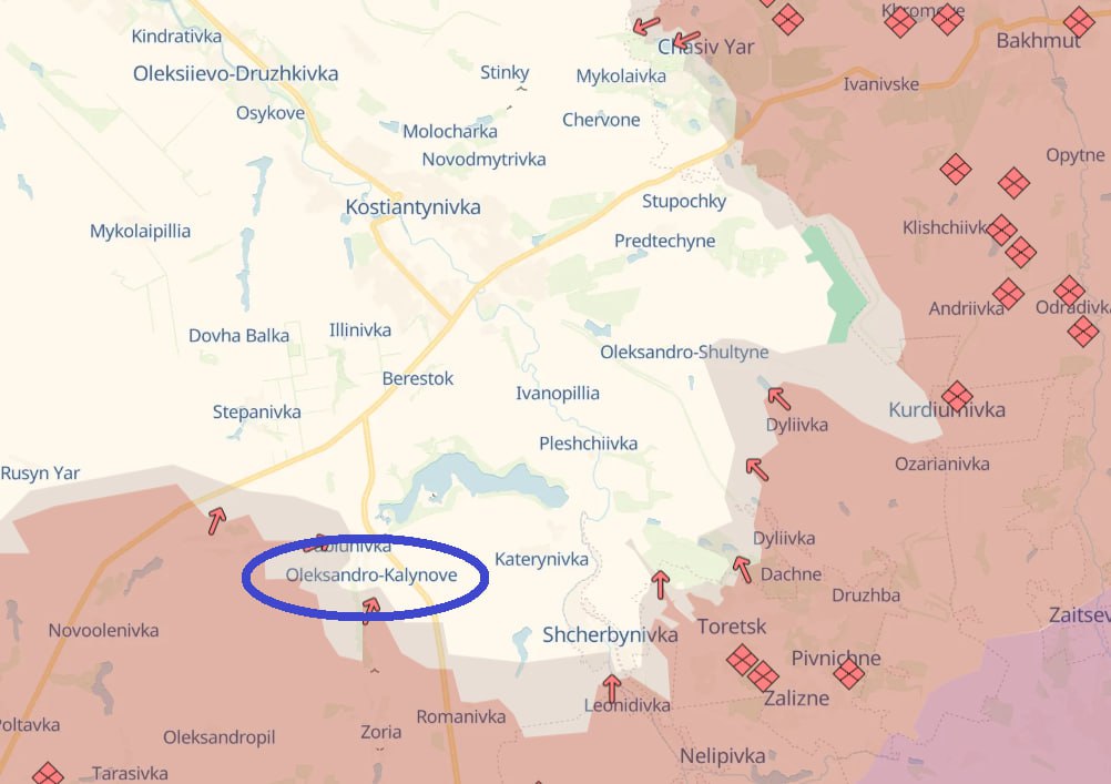 «Muchnyi» believes that after taking Oleksandro-Kalynove, the Russians have two options – either to move directly to Kostyantynivka (which is shorter but under shelling), or to advance eastward, bypassing through Katerynivka, Kleban-Byk, and Shcherbynivka to encircle the Ukrainian Armed Forces grouping.