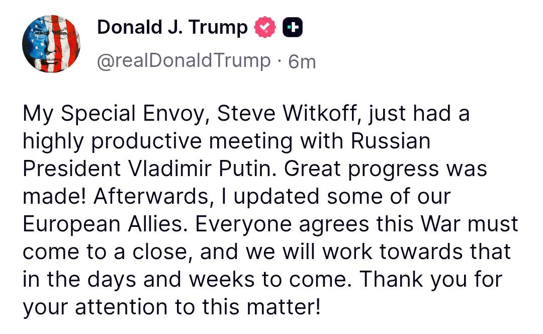 Trump on Witkoff’s meeting with Putin: "Significant progress has been achieved"