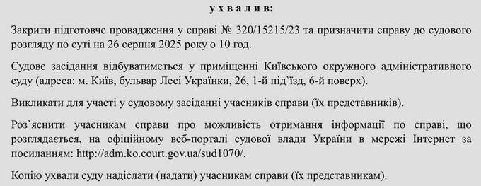 The Kyiv District Administrative Court has scheduled a hearing for the lawsuit of the former Deputy Head of the State Customs Service, Ruslan Cherkaskyi, for 10:00 on August 26, 2025.
