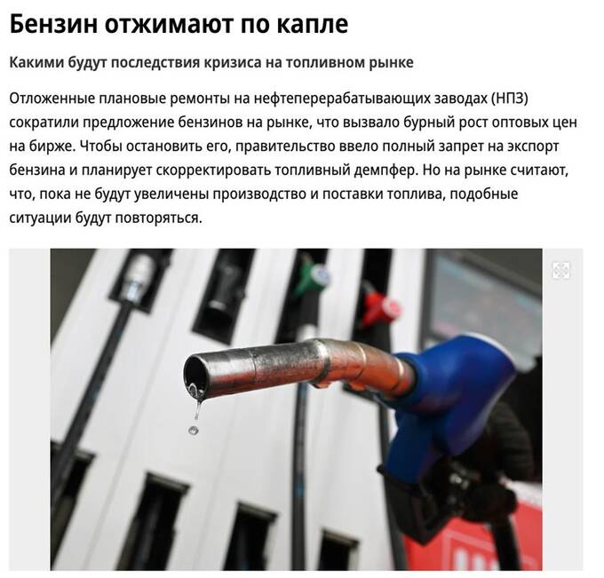 On July 28, the Russian authorities completely banned gasoline exports, but this did not help stabilize the market. "Even with the current export ban, domestic demand is not fully met. And the lack of published statistics on stock levels only increases market anxiety," noted Kaufman.