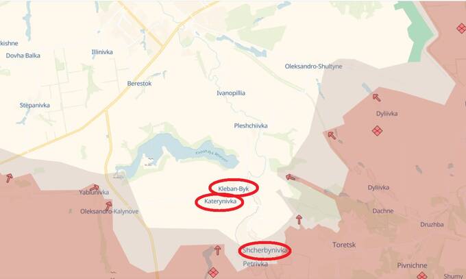 Kleban-Byk: the settlement is at the center of the confrontation, with the Russian army attempting to bypass it from various sides to cut off communication and encircle the village in a semicircle. Constant assaults are being carried out using drones, aviation, and heavy artillery.