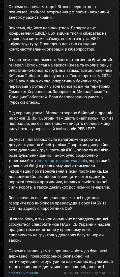 The basis for the investigation was the general’s family’s apartment, allegedly purchased at a reduced price. However, the SSU stated that the investigation ignored "the conclusions of numerous expert examinations that refuted the version of purchasing the housing at a reduced price", as well as "the conclusion of the NACP, which found no signs of illegal enrichment in Vityuk’s family".