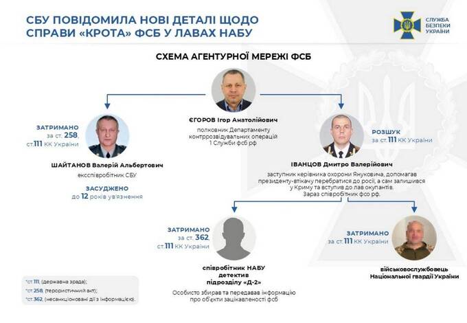 It is reported that the network was overseen by FSB officer Igor Yegorov, who began forming it in 2009. Its members included SSU General Valeriy Shaytanov (sentenced to 12 years), former bodyguard of Yanukovych Dmytro Ivantsov, and a National Guard serviceman.