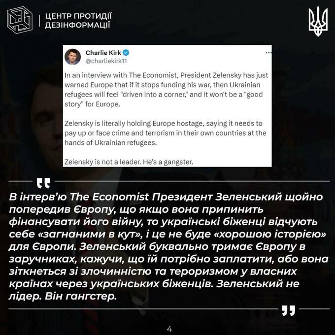 Заявлялося, що він просуває на Заході «тези російської пропаганди». Приклади цих тез також наводить ЦПД (див. скриншоти). У них, серед іншого, Зеленського критикують за те, що він "отримує чеки" від адміністрації Байдена.