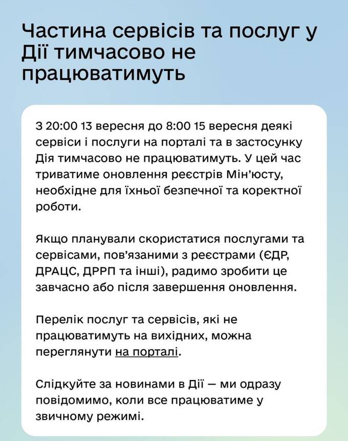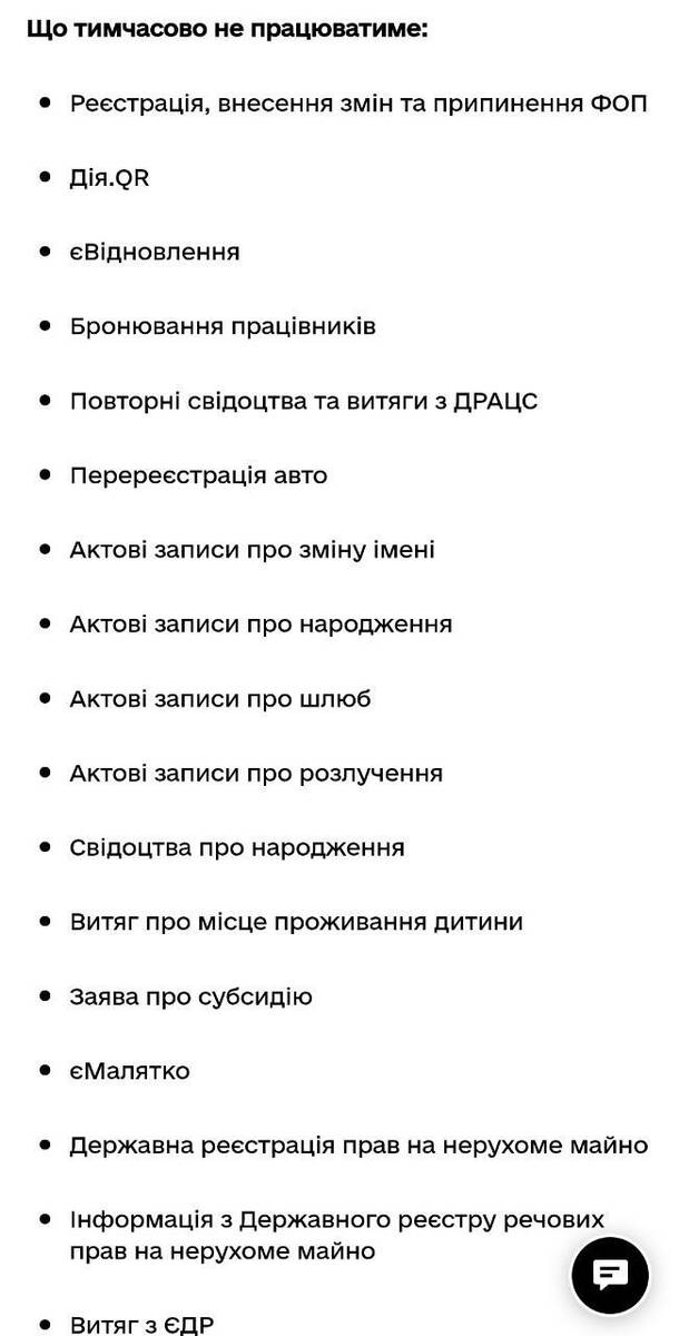 In total, 26 services are temporarily unavailable. Among them are registration, amendments, and termination of sole proprietorships (FOP), "Diya.QR", "eVidnovlennya", employee reservation, reissuance of certificates and extracts from the State Register of Civil Status Acts (DRACS), vehicle re-registration, records of birth, marriage, divorce, name change, "eMalyatko", state registration of property rights, subsidy applications, extracts from the Unified State Register (EDR), and others.