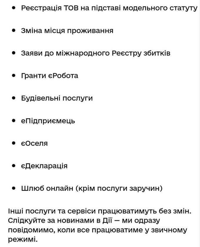 At the same time, a number of services will continue to operate without changes. Specifically, the following will remain available: registration of LLCs based on a model charter, change of residence, submission of applications to the International Register of Damages, "eRobota" grants, construction services, "ePidpryiemets", "eOselya", "eDeklaratsiya", and the online marriage service (except for engagement applications).