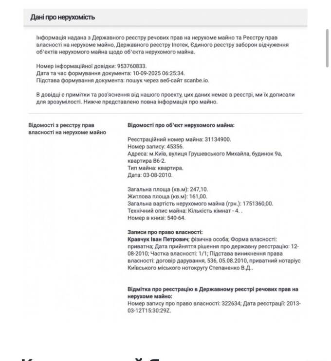 The real estate registry indicates that Ivan Kravchuk owns three apartments in the building at Mykhailo Hrushevskoho Street, 9a: apartment B15-2 with an area of 246 sq. m, apartment B15-1 with an area of 303 sq. m, and apartment B6-2 with an area of 247 sq. m. Additionally, he owns five parking spaces in the same building.