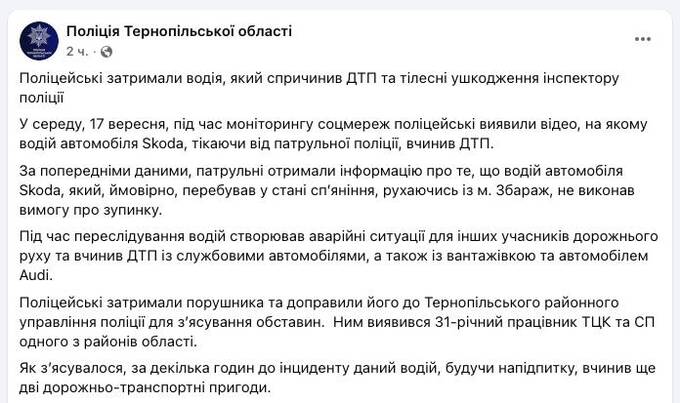 In Ternopil, an intoxicated employee of the TRC attempted to flee from six police crews pursuing him in a Škoda, hitting other vehicles along the way.