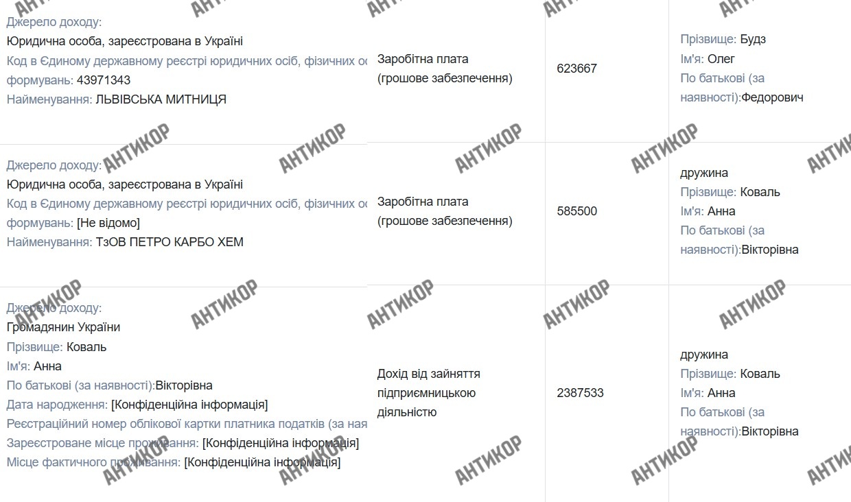 In the 2024 declaration, for example, a total family income of over 3.5 million hryvnias is indicated, of which 2.38 million were the wife’s business revenues. She is also mentioned as receiving a salary from the private company "Petro Karbo Chem" amounting to over half a million hryvnias. Against this income, Budz’s official salary of 623 thousand looks much more modest.
