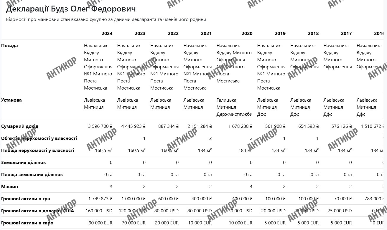 Together, this creates the image of a family whose financial capabilities are significantly higher than the average level, even by large entrepreneurial standards. The presence of large sums of cash currency, expensive "free" cars, and gifts raise legitimate questions: how transparent are the sources of these funds and do they correlate with official incomes? Especially when looking at Oleh Budz’s declarations systematically. And compare the figures of his wealth growth over the years. In 2015, Oleh Budz came to customs poor. And by 2025, he had become a millionaire. However, see for yourself and draw your own conclusions.