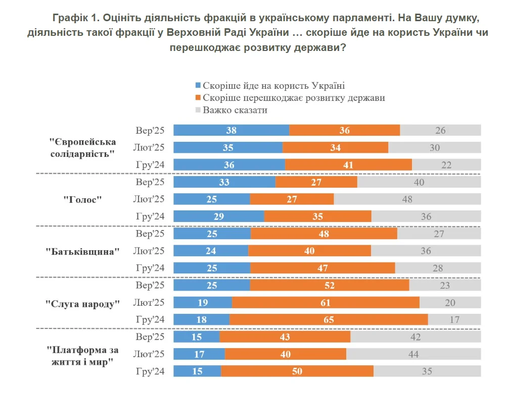 According to the survey data, only 25% of citizens consider the activities of "Servant of the People" to be beneficial. At the same time, compared to February 2025, the assessment of the president’s faction’s performance has improved.