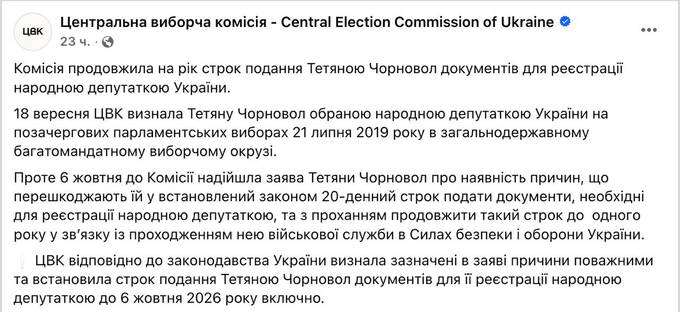 CEC: Tetyana Chornovol did not renounce her mandate, she only requested a one-year postponement
