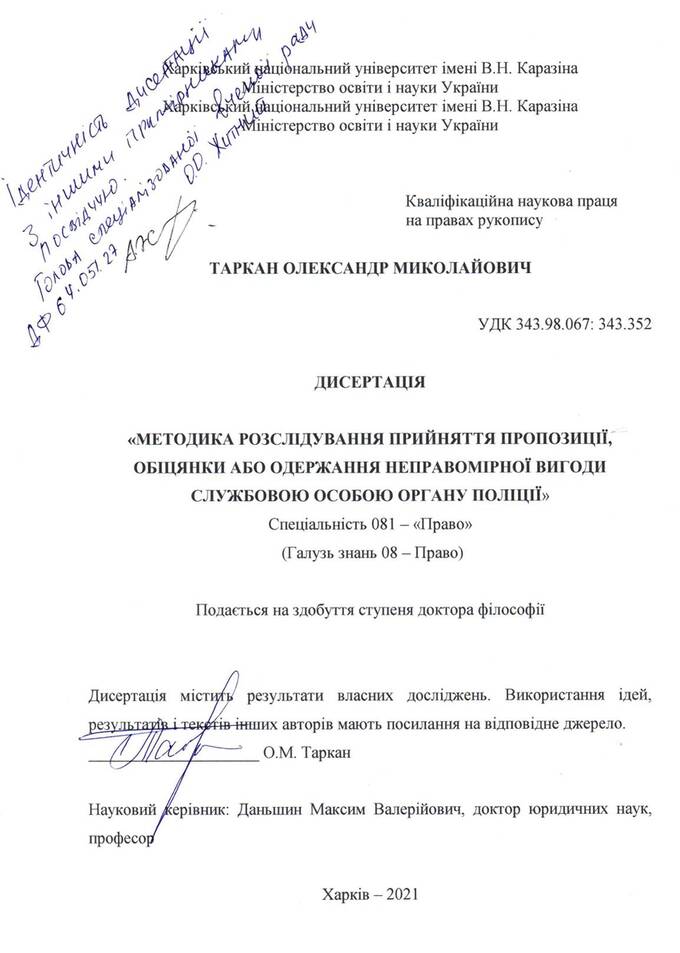 The research and publications of these authors dealt with issues of investigation and proof of the facts of acceptance of the proposition, promise, or receiving undue advantage by an official, and Tarkan, having rewritten them, added the words "of the police body" to the phrase "official" and presented them as his own, also writing about the alleged novelty of his research. And in October 2021, he defended his dissertation, earning the scientific degree of Doctor of Philosophy in the field of law.