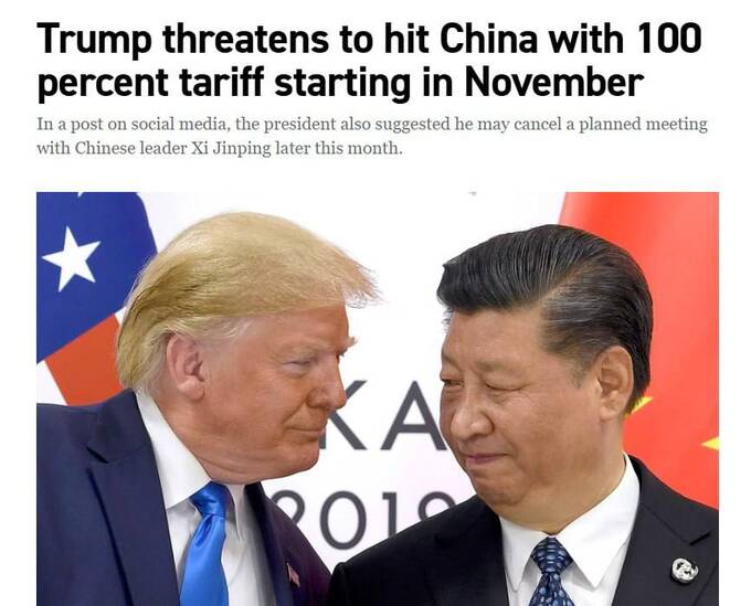 Тариф у 100 відсотків для Китаю фактично відновить ембарго на китайські товари, стверджує Politico. Це заява Трампа може також стати рішучим кінцем крихкого торгового перемир’я, яке США і Китай підтримували з травня. Це також вказує на те, що посилення контролю Пекіна над критично важливими постачаннями корисних копалин зводить нанівець стратегію Білого дому щодо зменшення торгових розбіжностей перед запланованою зустріччю Трампа і Сі Цзіньпіна в Південній Кореї наприкінці жовтня.