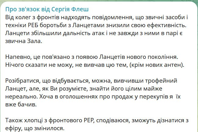 Conventional electronic warfare means have reduced their effectiveness in confronting Russian "Lancets", says drone and communication expert Serhiy Beskrestnov ("Flesh"), citing colleagues from the front line.