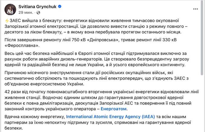 Recall, on September 23, power transmission lines were damaged, causing the Zaporizhzhya Nuclear Power Plant to be cut off from external power supply and switch to diesel generator power, which posed safety risks for the plant’s operation.