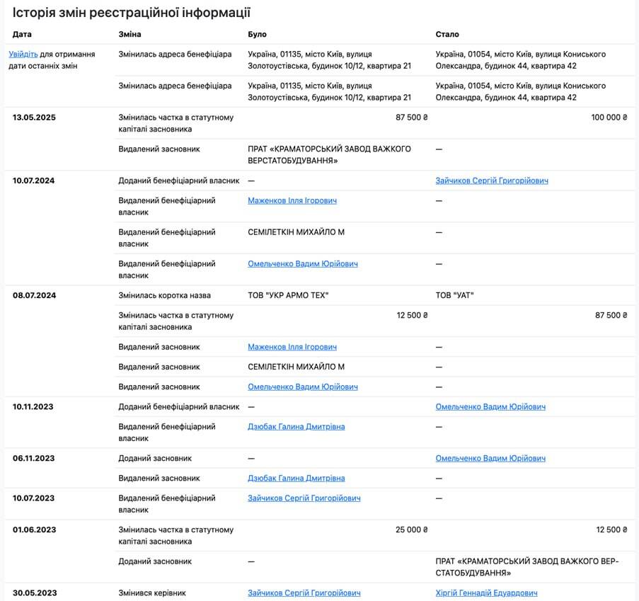 "Ukr Armo Tech" was established in August 2022, and among its historical co-founders are Mykhailo Semiletkin, Illya Mazhenkov, Vadym Omelchenko, Serhiy Zaychykov, and PJSC "KZVV," whose ultimate beneficiary is former MP Maksym Yefimov. By May 2025, most of them had exited the list of founders, leaving Zaychykov as the sole owner.