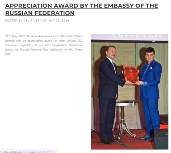Its owner, Ulugbekkhon Maksumov, is known for his pro-Russian stance – in particular, in 2016, he organized a Victory Day celebration in Dubai with St. George ribbons and concerts by Russian performers. Inkas Vehicle also sponsored the National Day of the Russian Federation in Abu Dhabi, and Maksumov personally received an award from the Russian ambassador to the UAE as a token of gratitude.
