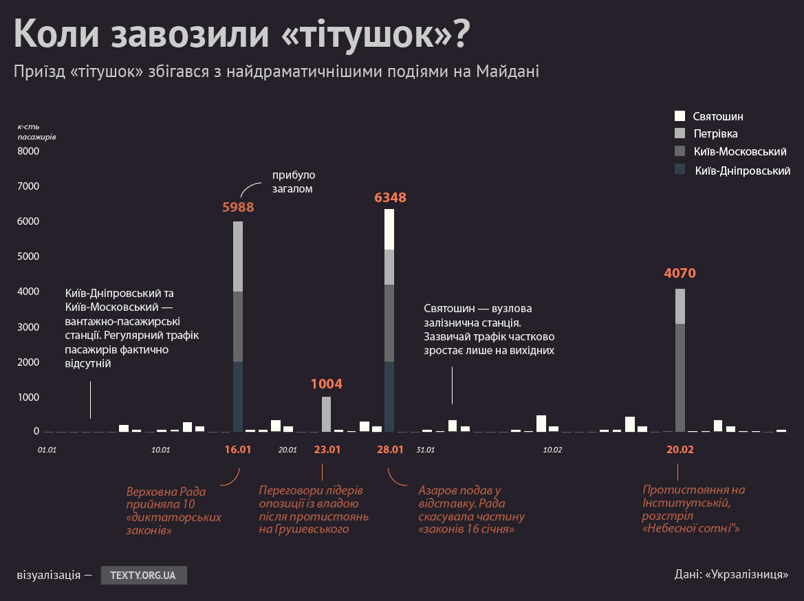 Виявилося, що дати прибуття поїздів на другорядні (на відміну від Києва-Пасажирського і Дарниці) станції збігаються з днями масових мітингів Антимайдану і провокацій так званих «тітушок» у січні-лютому 2014 року.