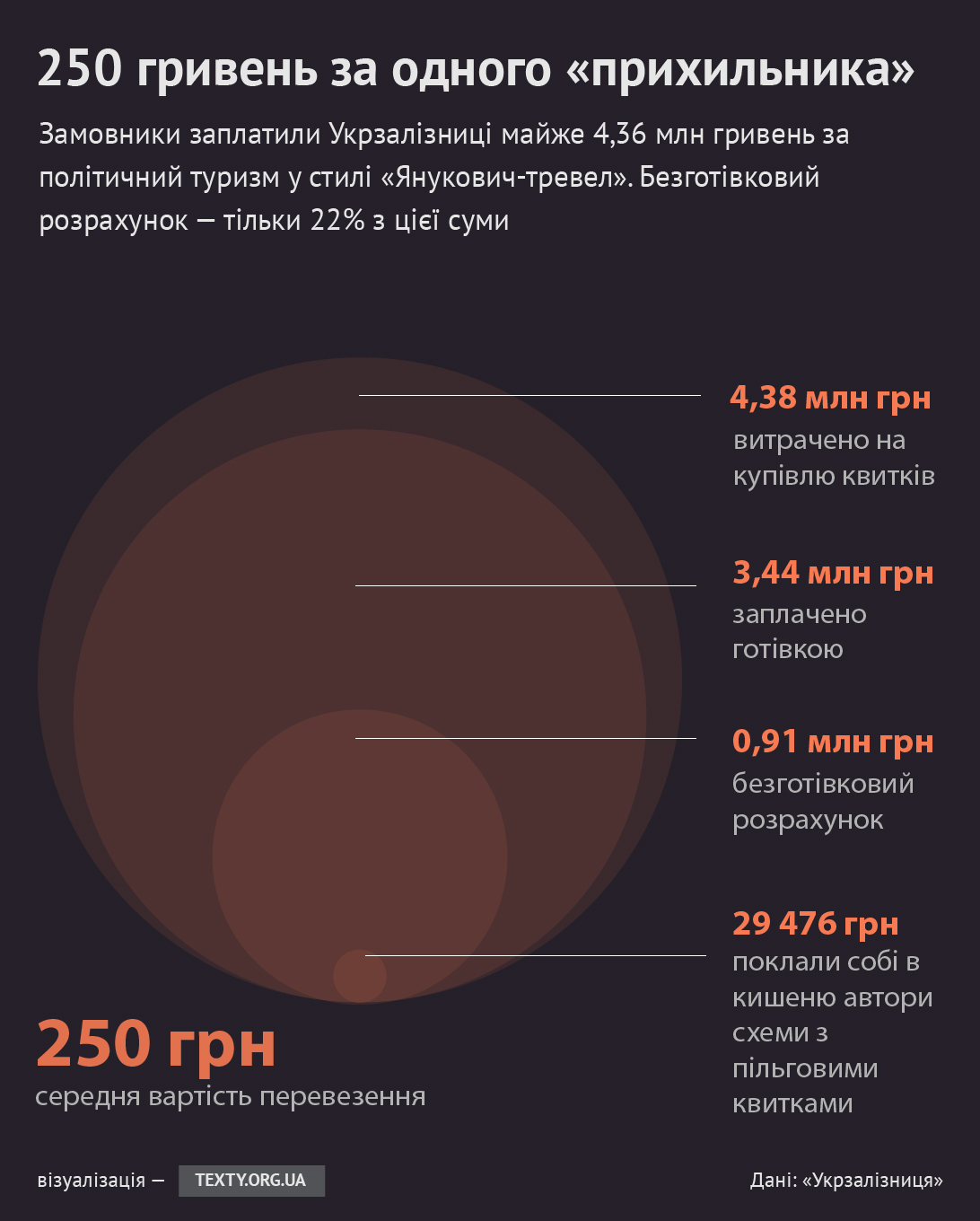 Загалом замовники 17 пар додаткових поїздів витратили на купівлю квитків 4,36 млн гривень. Середні витрати на доставку одного «майданарбайтера» в Київ і назад — 250 гривень 28 копійок.