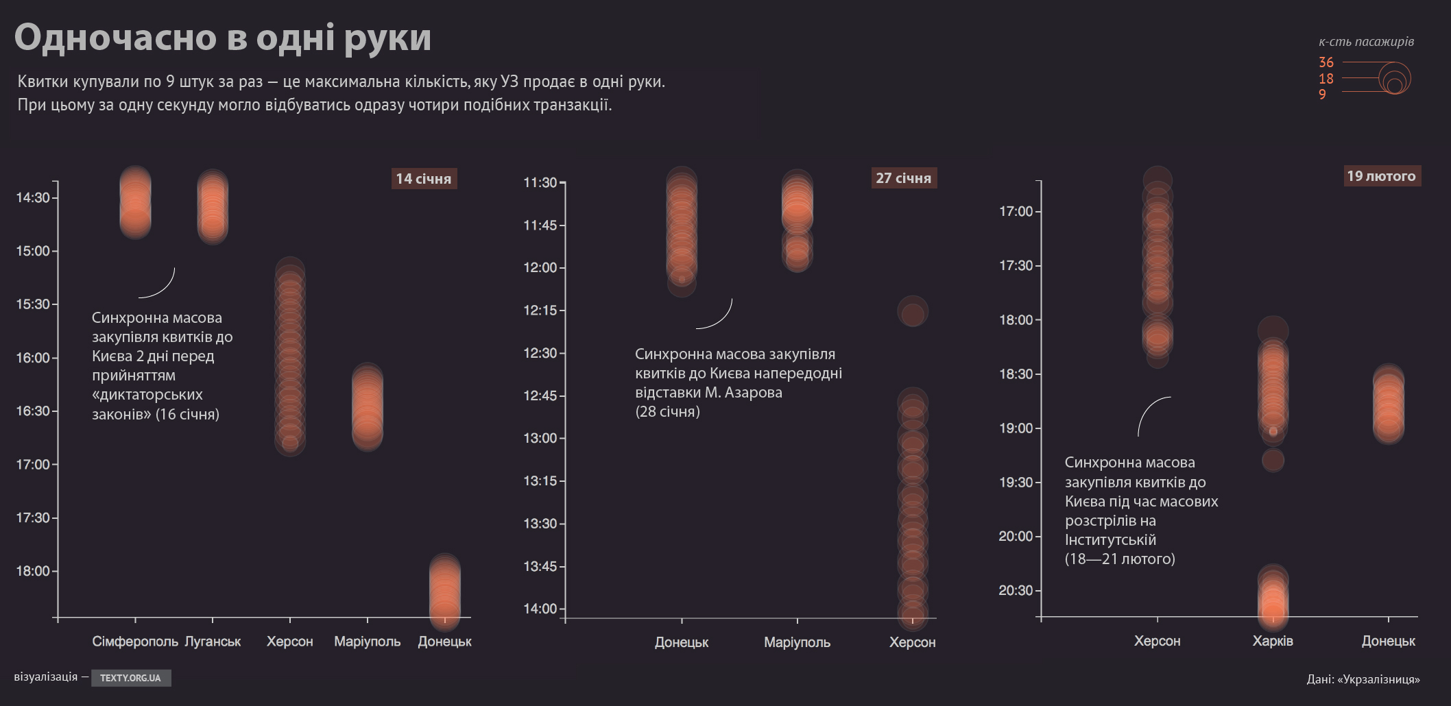 Бачимо певну синхронність — скажімо, квитки на додаткові поїзди 16.01.2014 з Сімферополя і Луганська починають купуватися в один і той же час 14 січня. 27 січня подібне відбувається з Донецьком та Маріуполем.