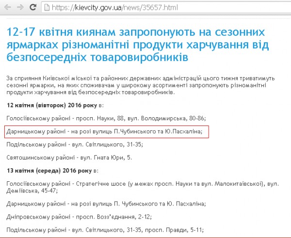 Оголошення на сайті КМДА про ярмарку поблизу Дарницького вокзалу