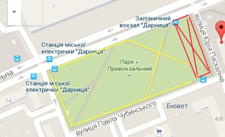 Сквер навпроти Дарницького залізничного приміського вокзалу з місця відпочинку вже давно перетворився на брудний торгівельний майданчик