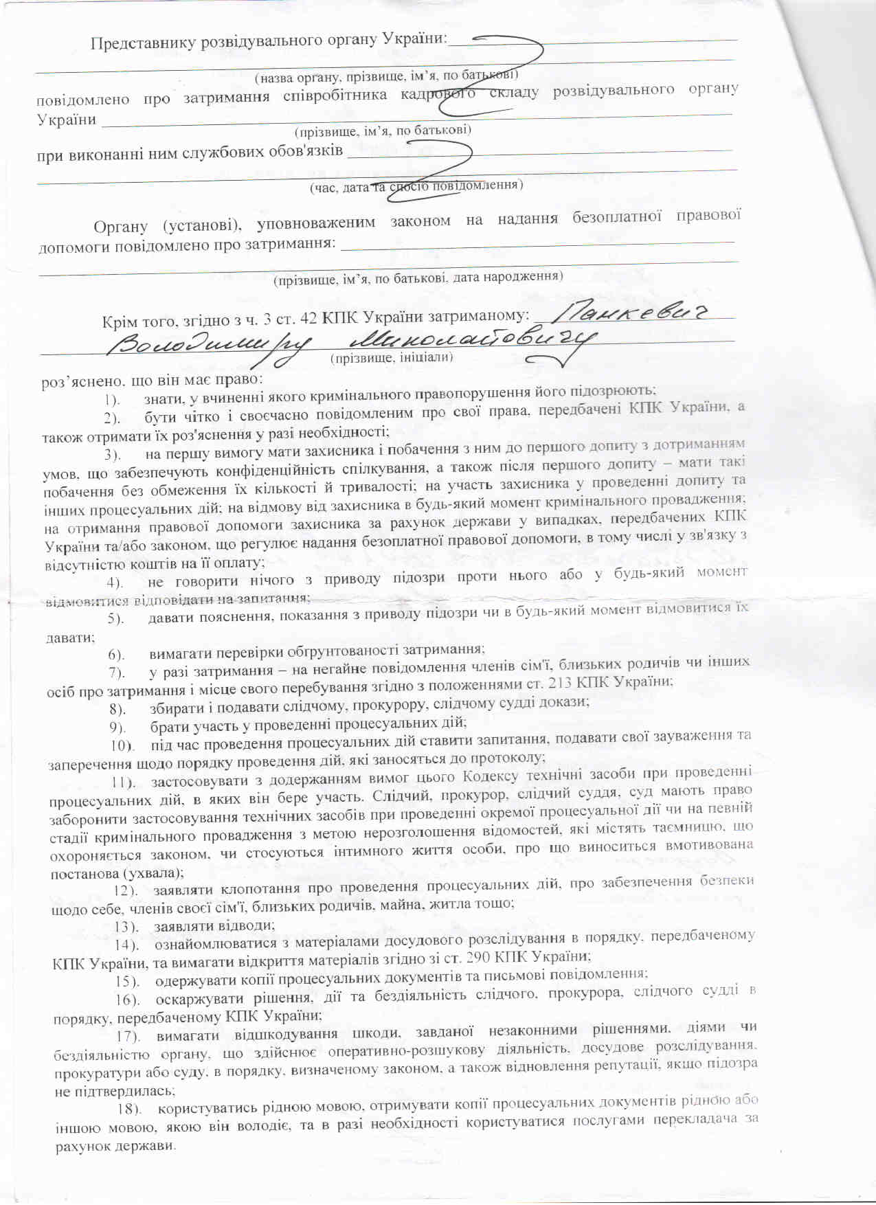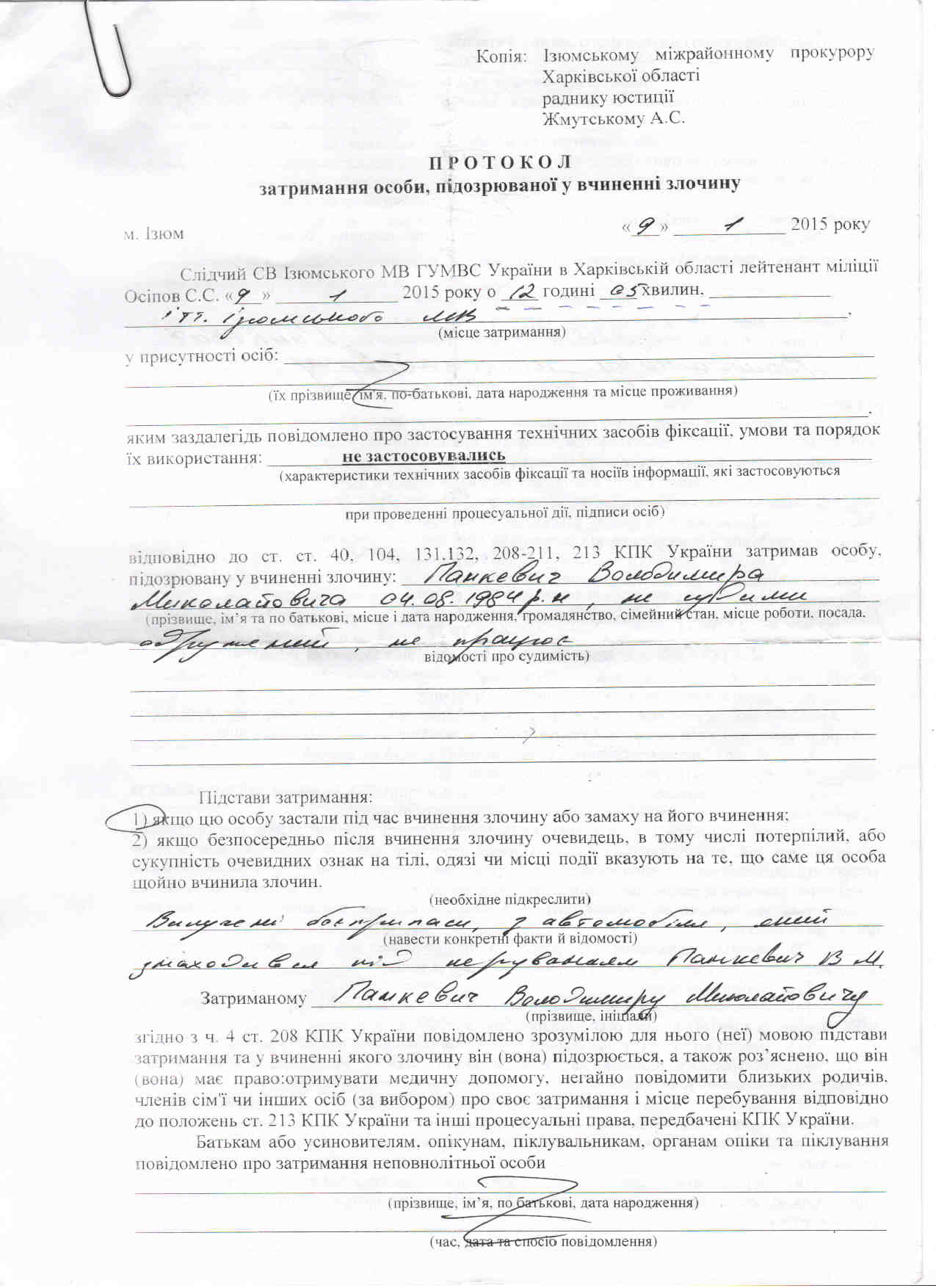 - слідчі, щоб довести справу до суду, оголосили Володимира Панкевича в розшук, при тому, що він постійно був на зв’язку та писав рекомендовані листи слідчому про те, що не переховується. Разом з тим, за тиждень до прийняття такої незаконної постанови Володимир був присутній в Ізюмському суді разом із слідчим і прокурором по розгляду одного з питань даного кримінального провадження. Проте, жодних викликів чи претензій до Володимира в «служителів закону» на той момент не було. І от ще один парадокс, жодних дій після прийняття такої постанови слідчий не вчиняв по провадженню, а тому невідомо для чого так свідомо затягувались строки досудового розслідування;