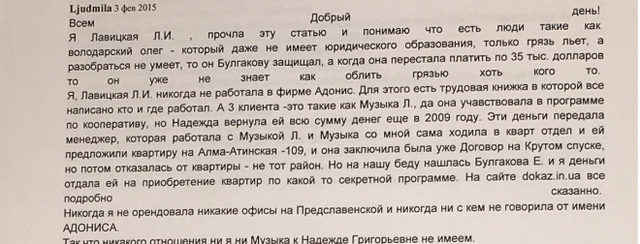 В противовес всем обвинениям со стороны Володарского(Паткина) существует официальное заявление от якобы «квартирной аферистки» Лавицкой о её непричастности к данному делу.