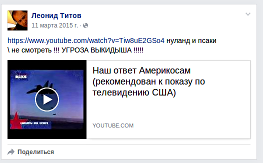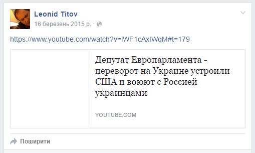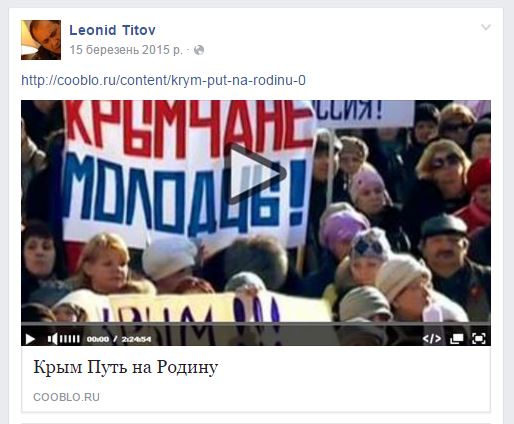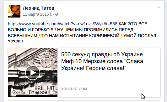 Также на своей странице господин Титов размещал агитки о наборе наемников в ряды боевиков и оккупантов Донецка. И эти агитки есть не что иное, как призывы к нарушению территориальной целостности Украины. Национальное приветствие «Слава Украине» Титов считает фашистским, а дословно — «коричневой чумой».
