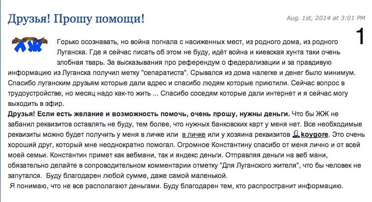 Пресловутые ростовские лагеря беженцев, которые он не вынимая воспевал в своих нетленках, не подошли его гению, а на даче в Переделкино как раз приключился ремонт, поэтому, написав эпохальный попрошайнический пост "Друзья! Прошу помощи!", он решил мимикрировать к "укропской" среде, словно доблестный Рихард Зорге внедриться в ненавистный социум и немедленно инициировать процесс его разложения изнутри.