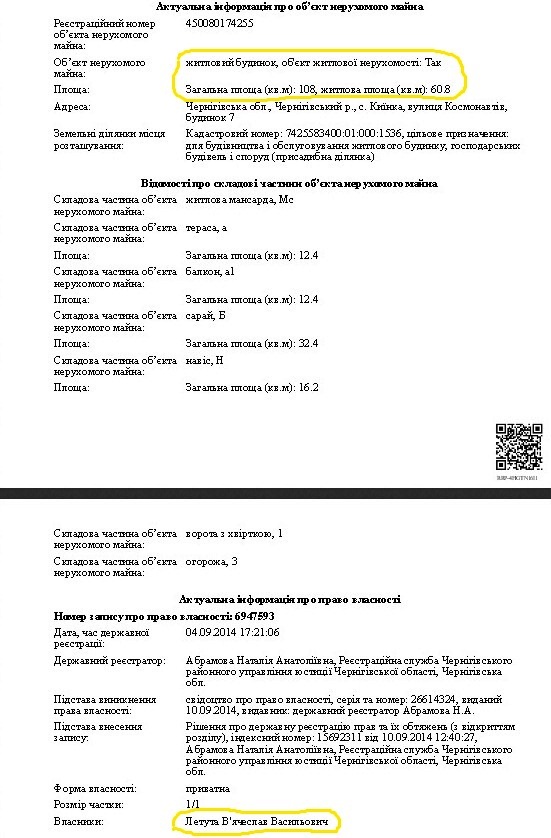 Згідно з витягом із майнового реєстру на Летуту записаний будинок на вул. Космонавтів, 7 у селі Киїнка, що знаходиться за 7 км від Чернігова. Загальна площа будинку – 108 кв м, з яких 61 кв м – житлова. Право власності було оформлене у вересні 2014 року.