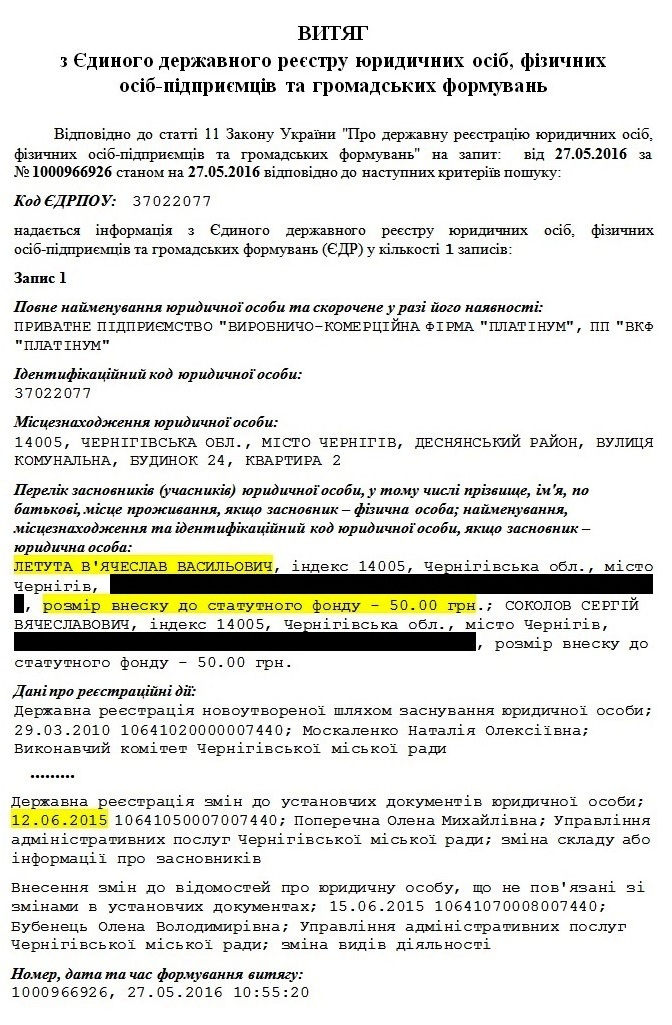 Основний вид діяльності «Платінуму» – оптова торгівля деревиною, будівельними матеріалами та санітарно-технічним обладнанням. Зауважимо, що у червні минулого року розмір внеску Летути до цієї фірми збільшився до 50 грн. У родичів депутата бізнесу нема.