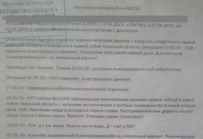 Женя: — За друга Вадика просили два миллиона гривен, Вадик порешал на 300 тысяч. С ним ехало еще три человека. Всех остановили, заставили выкопать себе могилы и закопали. Расстреливали Бес, Дима, Коля-рыжий. В Вадика было сделано пять выстрелов, он упал и хрипел. Эти говорят: «Да он живой!» и выстрелили еще раз, контрольный, в шею. И закопали. Но так как у него сильные легкие, он смог как-то вылезти из могилы, дополз до дороги, какой-то дедушка вызвал ему скорую. Под чужой фамилией 22 дня пролежал он в Луганской областной больнице в коме, когда пришел в себя — даже не знал, кому из друзей звонить, чтобы в батальоне не узнали, что он выжил. Друзья и волонтеры вывезли его в Ростов, там тоже делали операцию, сейчас он жив, находится в России.