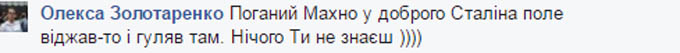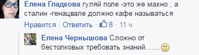 Зображення Сталіна на плакаті ілюструє рекламу кафе «Гуляй-поле», проте «Гуляйполе» — це вільна держава часів громадянської війни 1918-1922 років, організована українським політичним і військовим діячем Нестором Махно під час визвольного руху на півдні України, яка не має відношення до радянського диктатора Сталіна.