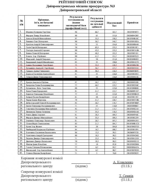 Назначению не помешало даже то, что в рейтинговом списке кандидатов на руководящие должности прокуратуры Анатолий Кузьменко занял лишь 13 место. Тест на знание законодательства он составил на 71 балл, а на тестировании общих способностей набрал 56,7 баллов.